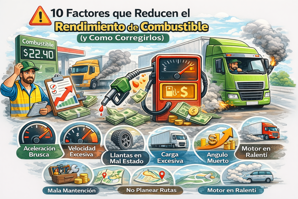 En este articulo detallamos los 10 factores con mayor impacto en el consumo de combustible de camiones y vehiculos de carga, con datos de porcentaje estimado de desperdicio y soluciones practicas para cada uno.