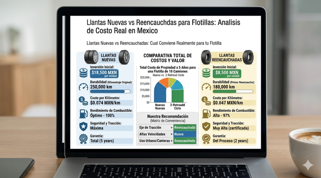El gasto en llantas es el segundo rubro mas importante en la operacion de una flotilla de carga en Mexico, solo detras del combustible. Para un tractocamion de 5 ejes, un juego completo de llantas nuevas puede superar los $150,000 MXN. Con esos numeros, la tentacion de usar llantas reencauchadas es enorme.